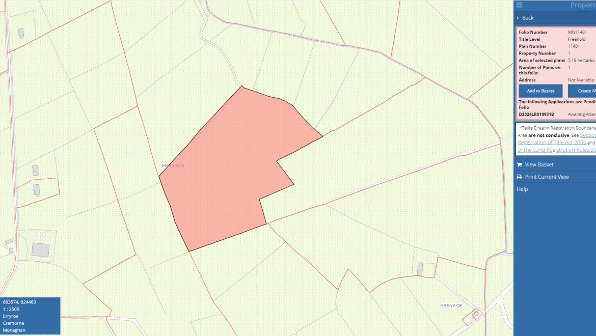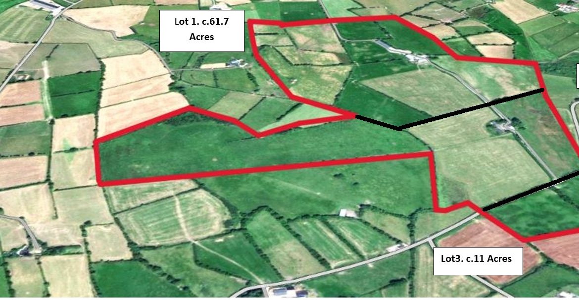 Lot 1 – c.24.97 ha (c.61.70 acres) to incl. 10 Bay Slatted Shed, Outbuildings and Derelict Building.
