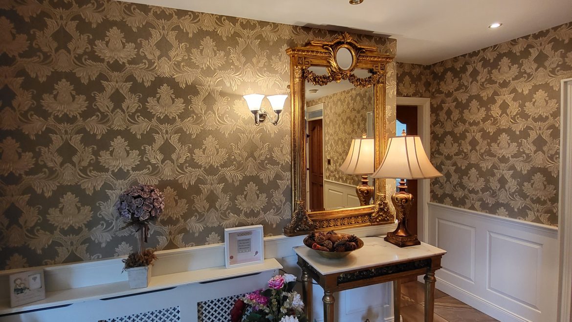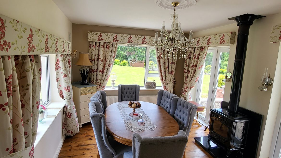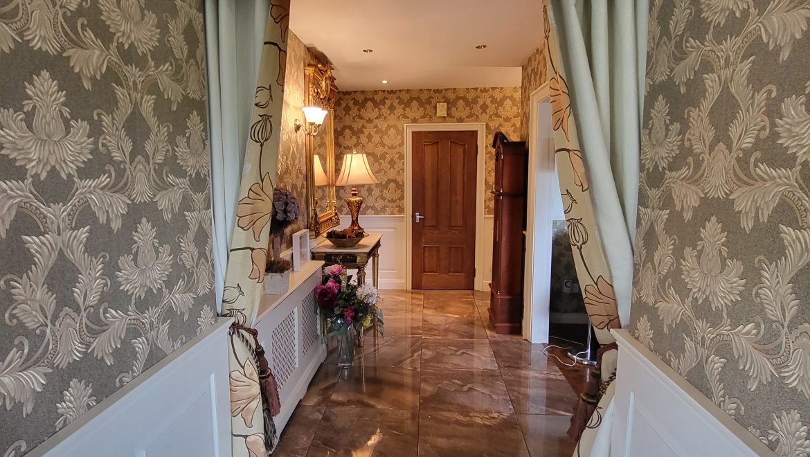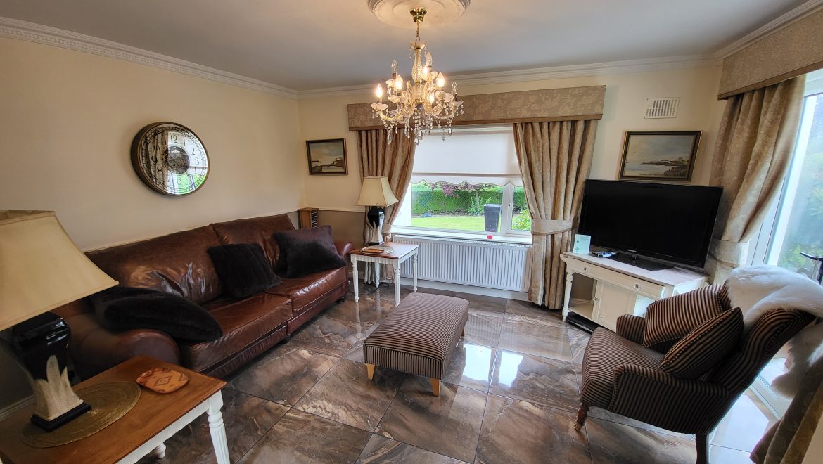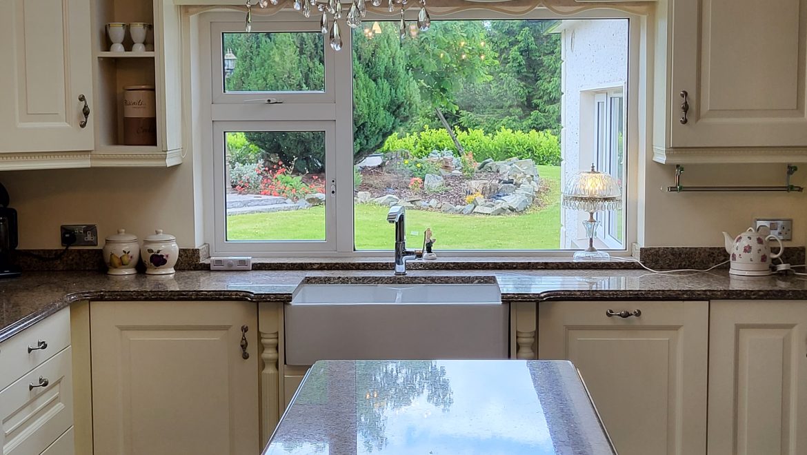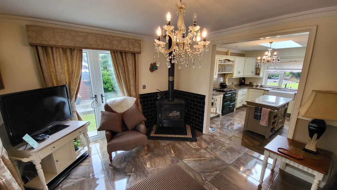 Upon entering this home, you are immediately struck by the owner’s flair for interior design with careful consideration given to every detail. The entrance hall has porcelain tiling and beautiful wall panelling leading to an inviting living room with feature marble surround. Situated between the snug and formal dining room is an impressive kitchen which overlooks the sunny garden to the front and rear of the property. Custom cream cabinetry, granite worktops, a Belfast sink and Rayburn range cooker are just some of the impressive features of this inviting space.